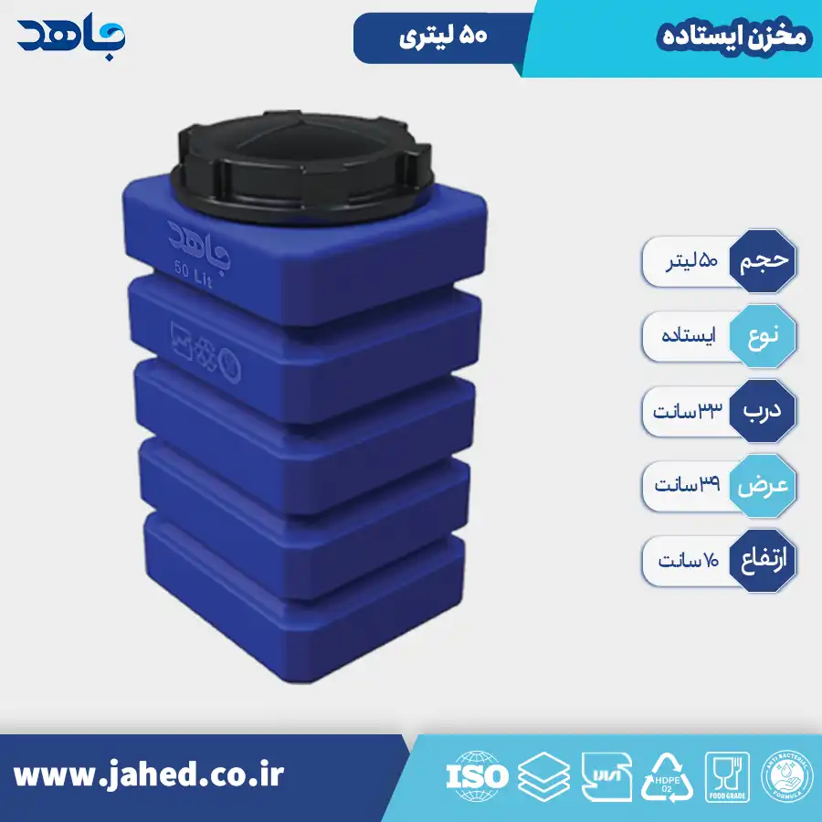 مخزن ایستاده ۵۰ لیتری برنده جاهد، گزینهای جمعوجور و مقاوم برای ذخیرهسازی بهینه آب در فضاهای کوچک مسکونی.
